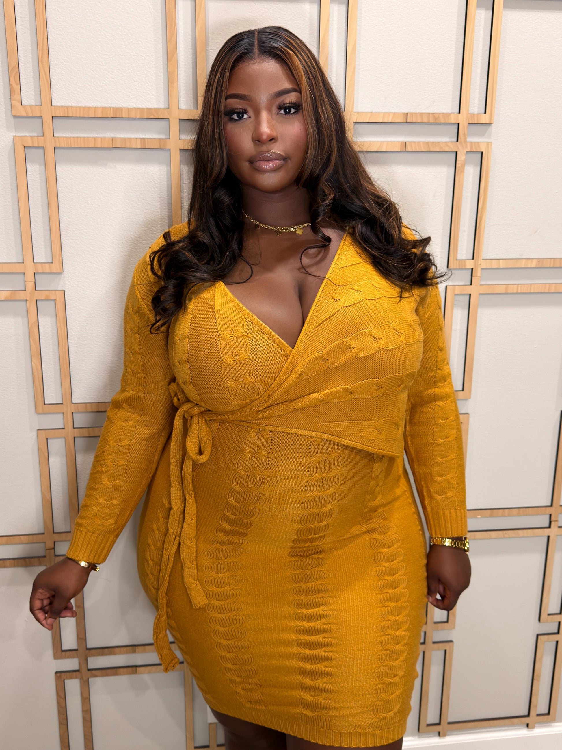 The sweater material long sleeve side wrap knee length dress offers a combination of warmth and versatility. Made from high-quality materials, it provides comfort while ensuring a flattering silhouette. The knee-length design enhances wearability for various occasions, making it a functional addition to any wardrobe.