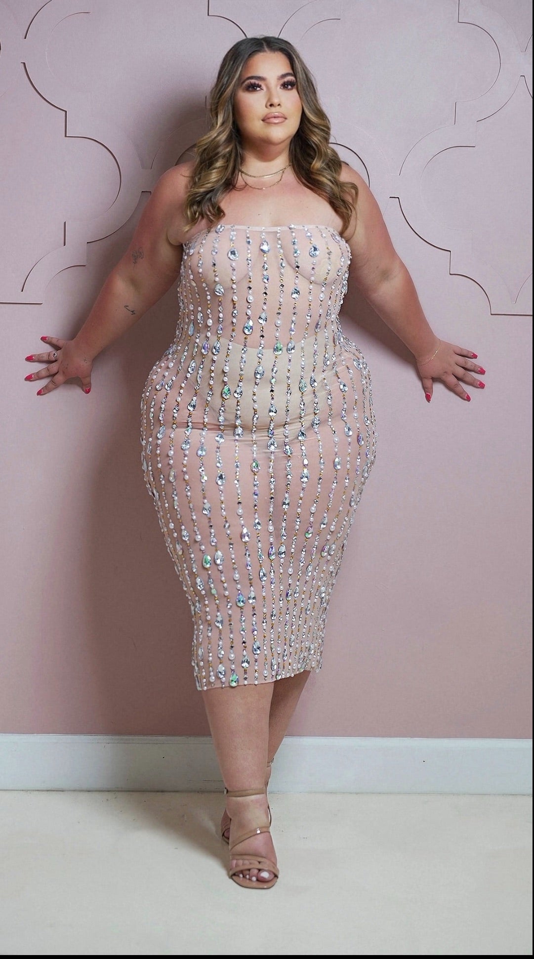 The dress in the image is a form-fitting, strapless, nude-toned midi dress that gives a sheer illusion. It’s beautifully decorated with vertical rows of sparkling rhinestones or crystal embellishments, which create a glamorous and eye-catching effect.